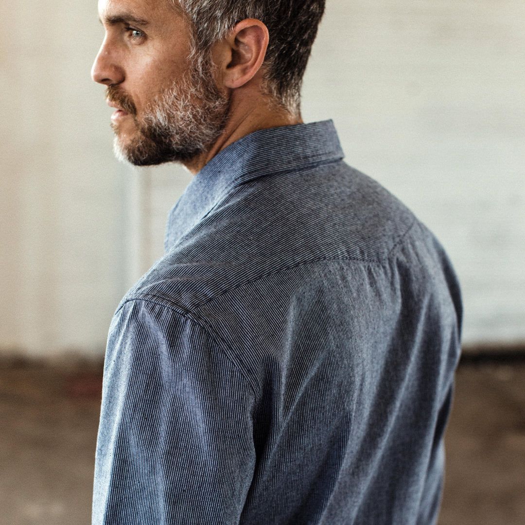 Rinsed for a soft, well-worn feel right out of the box, this shirt is ready for the ride ahead. The Western Shirt in Indigo Stripe by Cuesv.