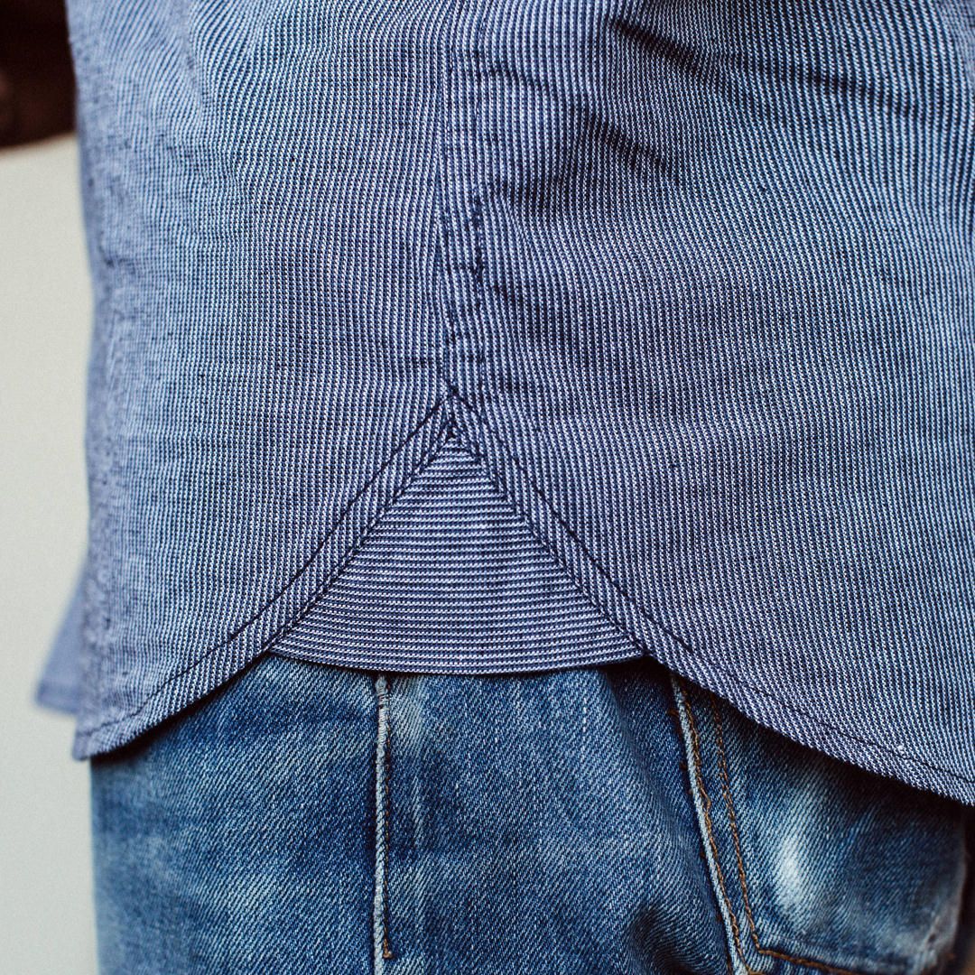 - Double-needle chainstitch fell at side seam and single needle French fell at arm-hole.